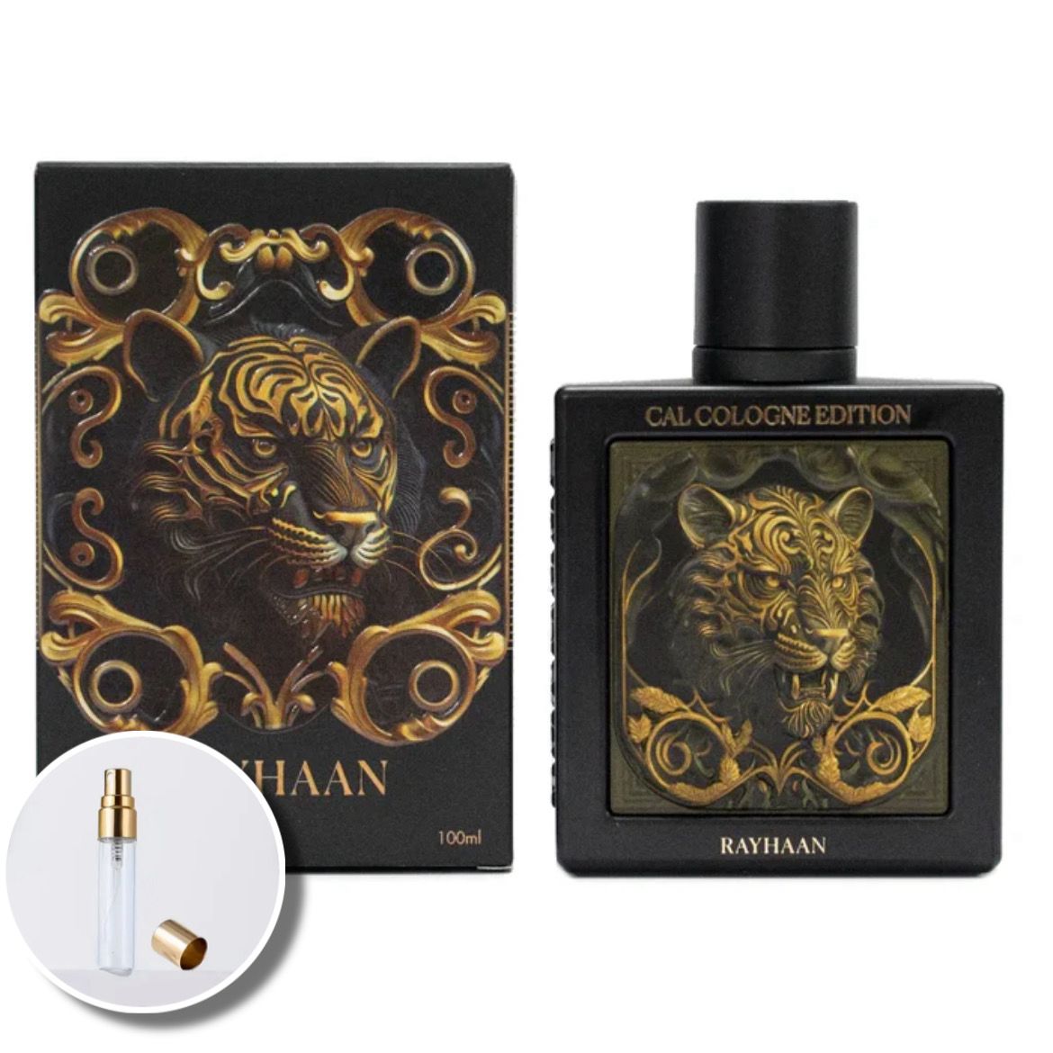 A Rayhaan Tiger Cal Cologne Edition é um perfume tipo extrait de parfum amadeirado-especiado, altamente concentrado e de longa duração, amplamente considerado uma alternativa acessível ao perfume de designer Penhaligon's Halfeti.